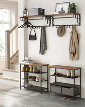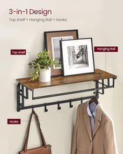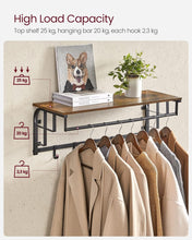 Einstaklega falleg vegghilla sem kemur með hengi og fimm snögum sem hægt er að taka af og færa til af vild. Hengið er úr lituðu stáli og hillan klædd með plastviðarlíki.